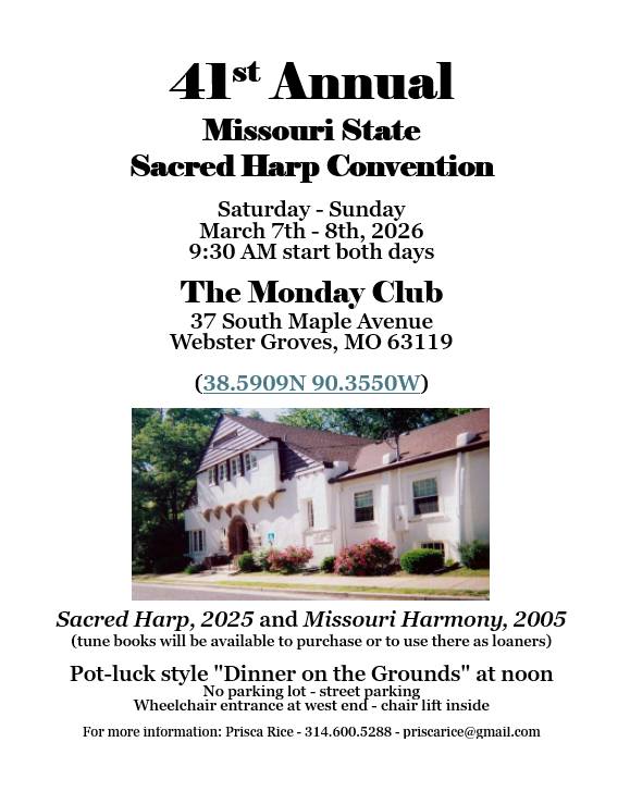 ![]() The Monday Club - 37 South Maple Avenue, Webster Groves, MO 63119 Accessibility Information No auditions, rehearsals or performances. Free. We just sing early American acapella choral music in the Sacred Harp tradition, and have a wonderful time with friends. Everyone is welcome. Join us. We meet to sing on the first, third and fifth (if there is one) Monday of each month, 6 to 8 PM, at Old Orchard Presbyterian Church, 640 Amelia Ave at Fairlawn, Webster Groves, MO 63119 map. Call Dave at 618-444-7828 or e-mail Paul at stlfasola@gmail.com for details and updates, or visit our Facebook group page for up to date information. The St. Louis Shape Note Singers are a loose affiliation of singers in the old colonial and southern tradition of Sacred Harp singing using shape note notation. We usually sing from The Sacred Harp, 1991 Denson edition, as well as from The Missouri Harmony, 2005 edition, tunebooks whose origins date from the early 1800s. The St. Louis Shape Note Singers are one of several dozen active shape note singing groups across the country and around the world, some continuously active for over 100 years and some only recently organized. Following this tradition, we do not have auditions, rehearsals or performances as such. We simply gather to sing the music we love. Musical talent or training is not required. We are entirely non-denominational as well, welcoming all regardless of creed or lack thereof.